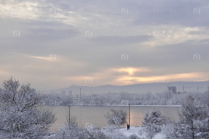 Морозное туманное зимнее утро над Енисеем в центре Красноярска