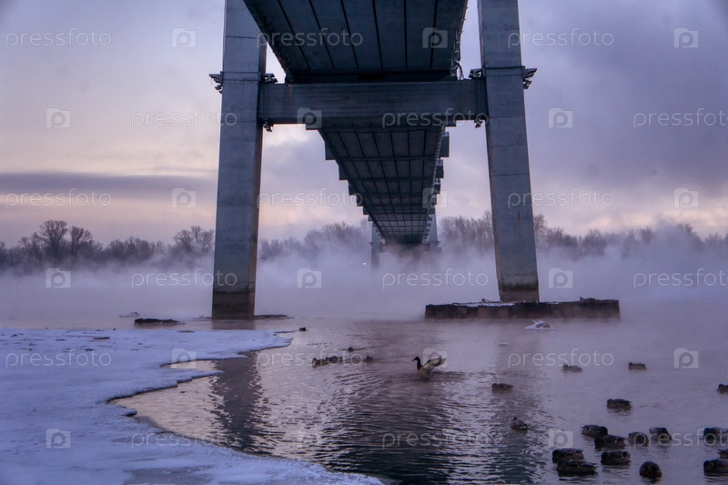 Морозное туманное зимнее утро над Енисеем в центре Красноярска