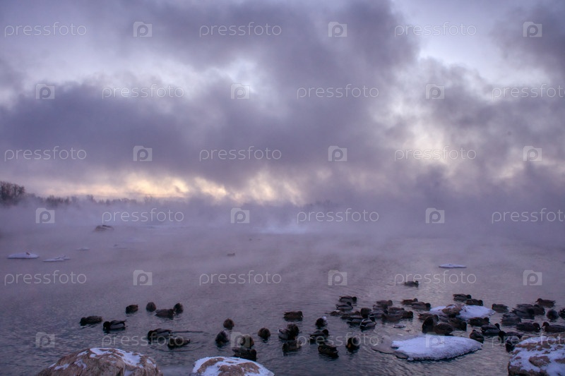 Морозное туманное зимнее утро над Енисеем в центре Красноярска