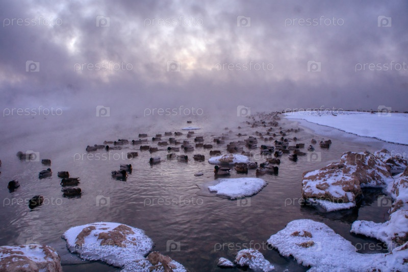 Морозное туманное зимнее утро над Енисеем в центре Красноярска
