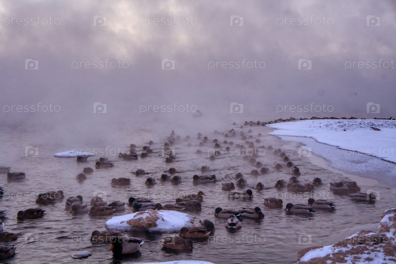 Морозное туманное зимнее утро над Енисеем в центре Красноярска