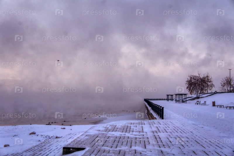 Морозное туманное зимнее утро над Енисеем в центре Красноярска