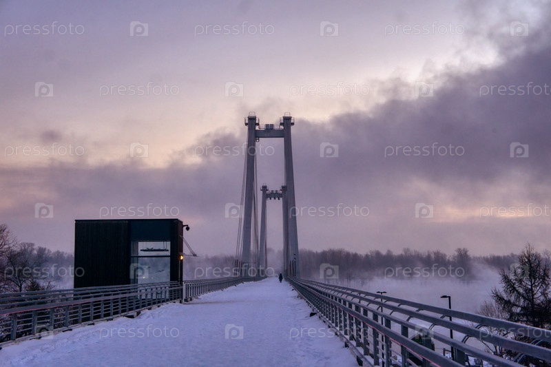 Морозное туманное зимнее утро над Енисеем в центре Красноярска