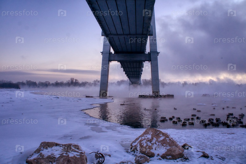 Морозное туманное зимнее утро над Енисеем в центре Красноярска