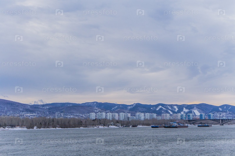 Морозное туманное зимнее утро над Енисеем в центре Красноярска