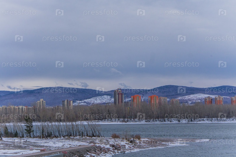 Морозное туманное зимнее утро над Енисеем в центре Красноярска