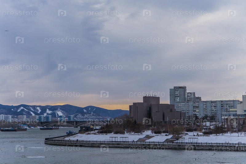 Морозное туманное зимнее утро над Енисеем в центре Красноярска