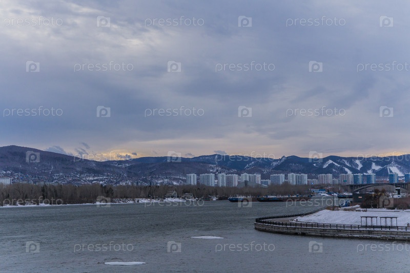 Морозное туманное зимнее утро над Енисеем в центре Красноярска