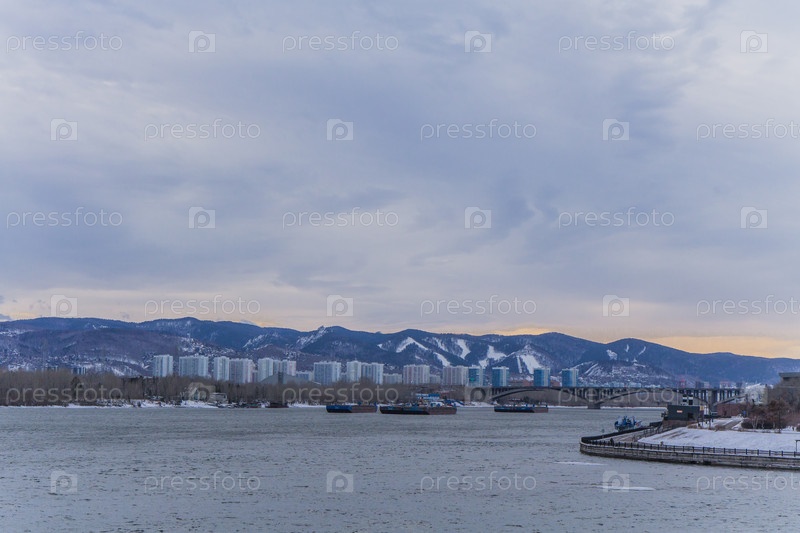 Морозное туманное зимнее утро над Енисеем в центре Красноярска