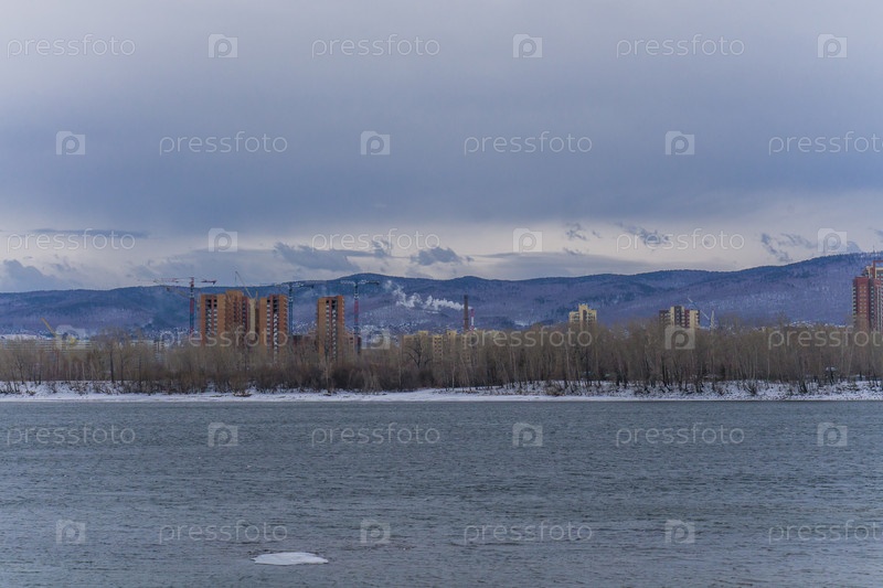 Морозное туманное зимнее утро над Енисеем в центре Красноярска