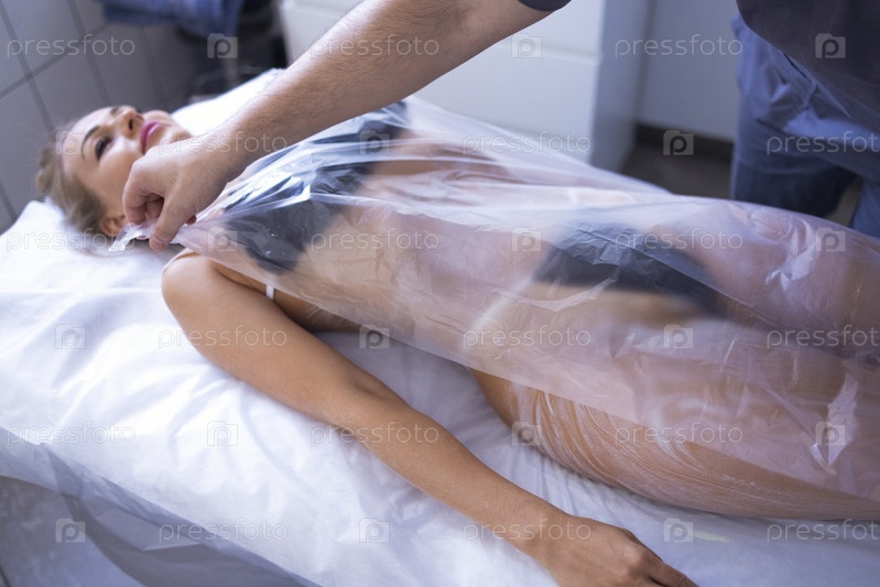 Молодая блондинка делает косметологические процедуры в спа-салоне. Полное антицеллюлитное обертывание. Косметолог-мужчина накрывает свою клиентку полиэтиленовой пленкой