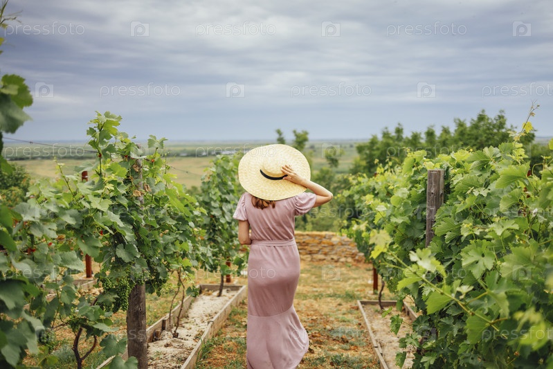 Женщина в шляпе в винограднике на солнце