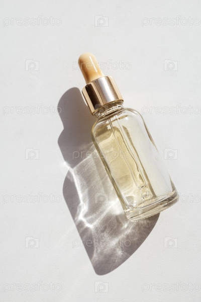 Сыворотка с коллагеном и пептидами в прозрачной стеклянной бутылке на светлом фоне с тенью солнечного света