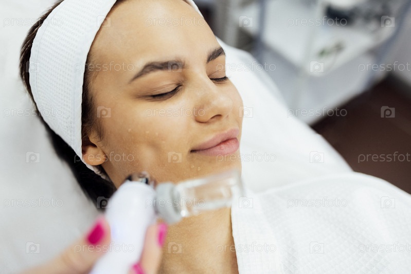 Кавказская женщина проходит процедуру пилинга лица в салоне красоты