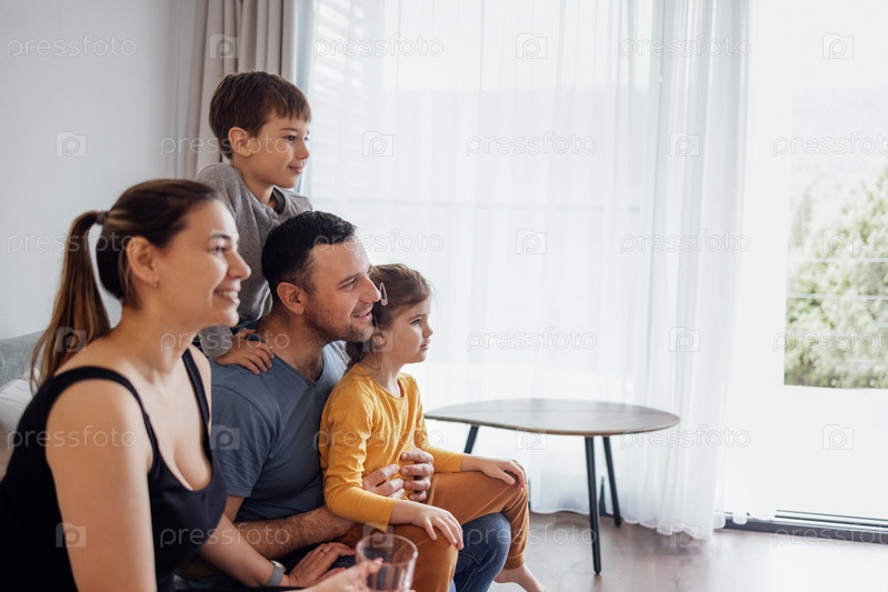 Молодая счастливая семья с двумя детьми смотрит телевизор. Расслабленные улыбающиеся люди и милые детишки проводят время дома