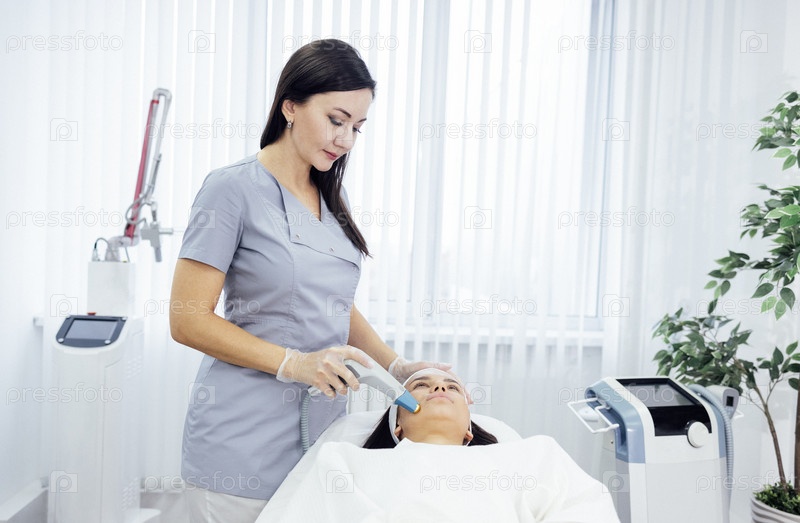Привлекательная женщина-косметолог в серой форме и прозрачных перчатках делает процедуру чистки лица для своего молодого клиента