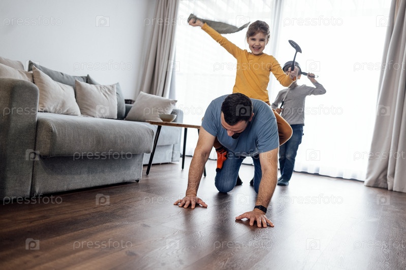 Забавная милая смеющаяся девочка катается на папе и машет полотенцем
