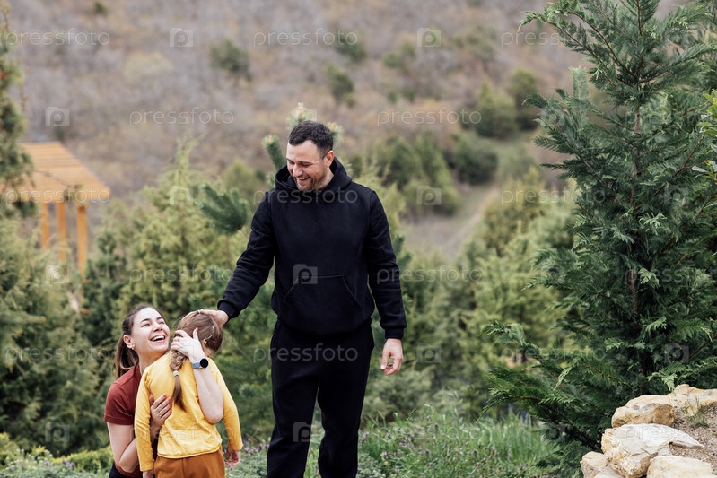 Молодая улыбающаяся пара протягивает руки своей милой дочери