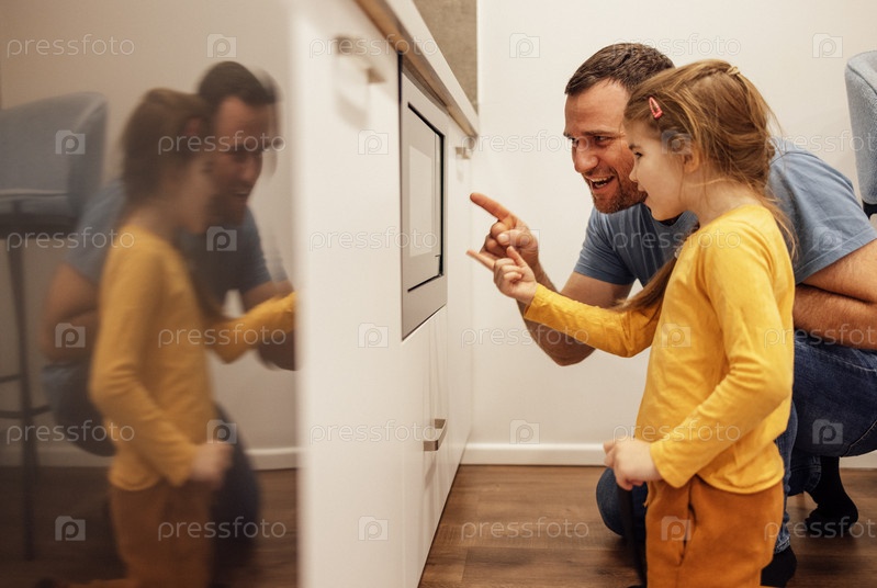 Молодой папа готовит вместе со своей милой дочерью на кухне дома