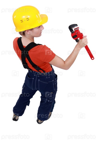 Водопроводчик держит гаечный ключ