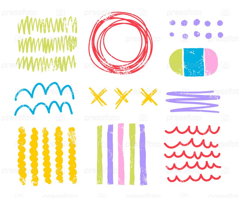 Нарисованные вручную линии каракулей, кривые формы, объекты, мазки кистей