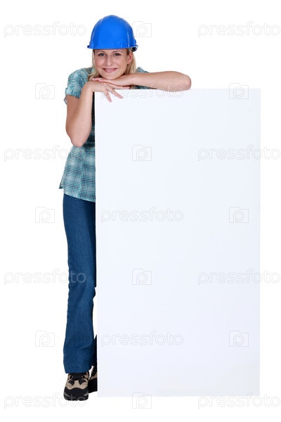 Женщина с защитным шлемом опирается на белый баннер