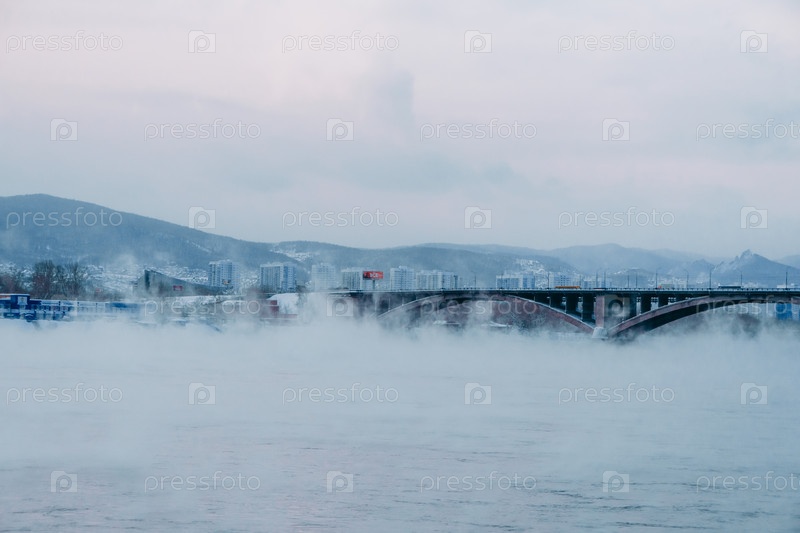 Морозное туманное зимнее утро над Енисеем в центре Красноярска