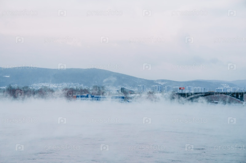 Морозное туманное зимнее утро над Енисеем в центре Красноярска