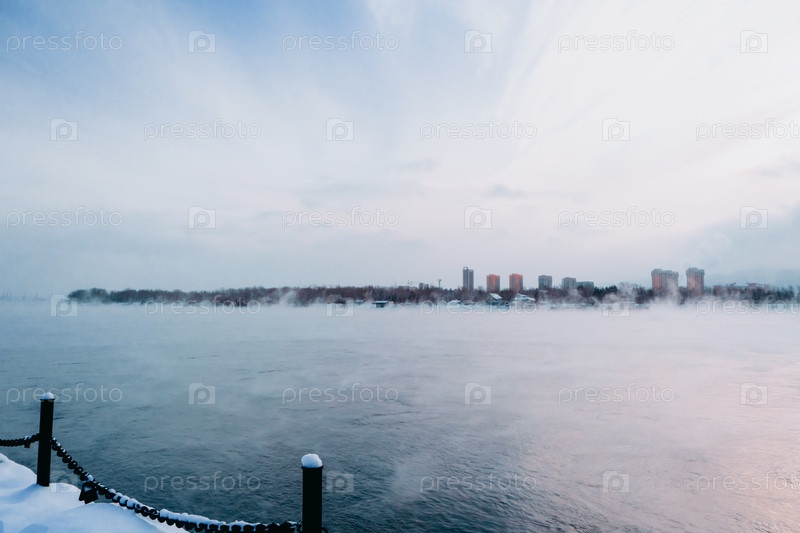 Морозное туманное зимнее утро над Енисеем в центре Красноярска