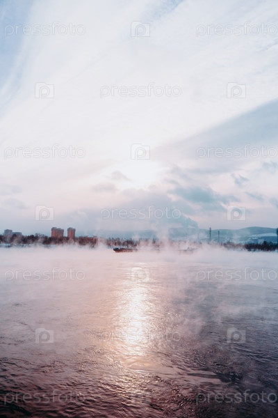 Морозное туманное зимнее утро над Енисеем в центре Красноярска