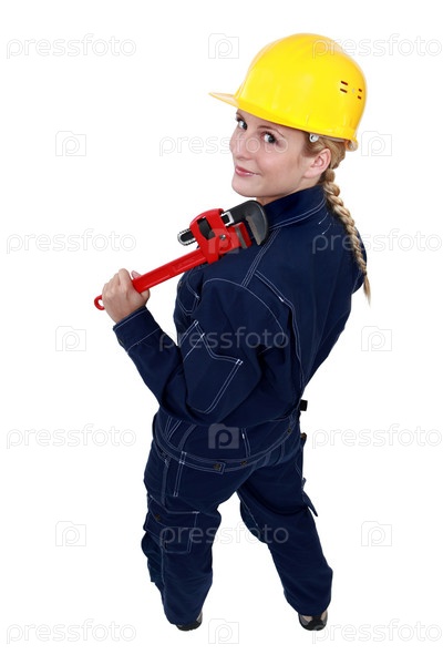 Рабочий держит гаечный ключ