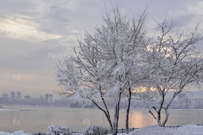 Морозное туманное зимнее утро над Енисеем в центре Красноярска