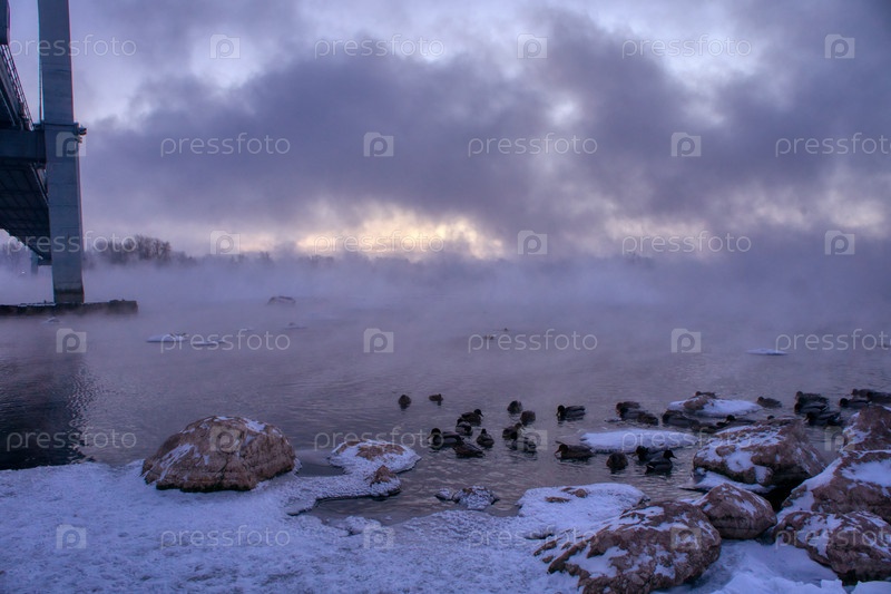Морозное туманное зимнее утро над Енисеем в центре Красноярска