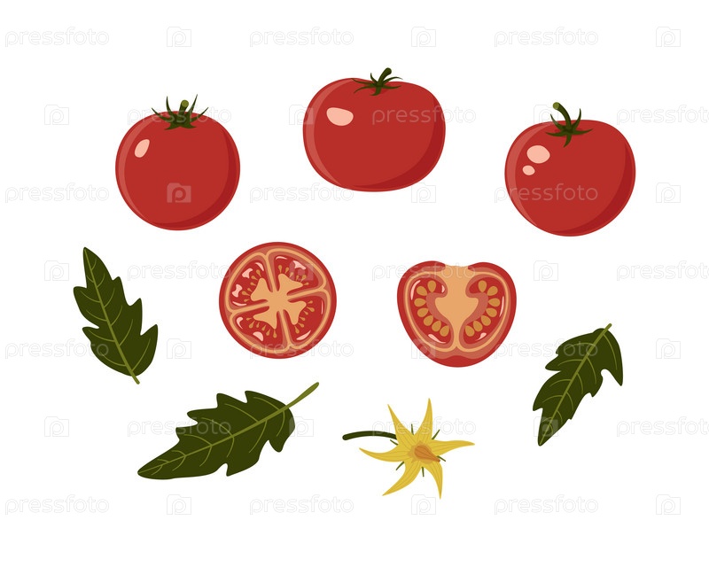 Набор созревших блестящих помидоров, ломтиков, листьев и цветов. Цветовая иллюстрация, плоский стиль. Белый изоляционный фон. EPS10