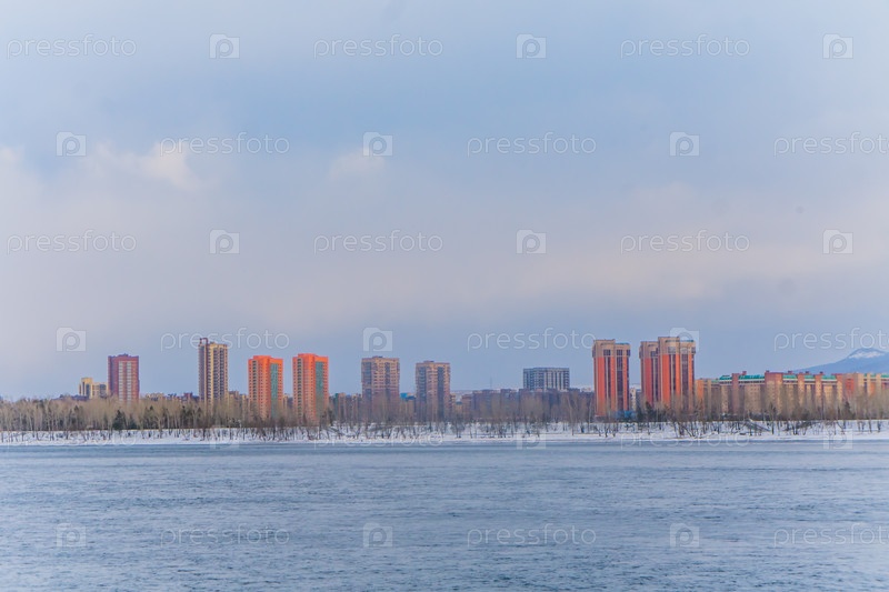 Морозное туманное зимнее утро над Енисеем в центре Красноярска