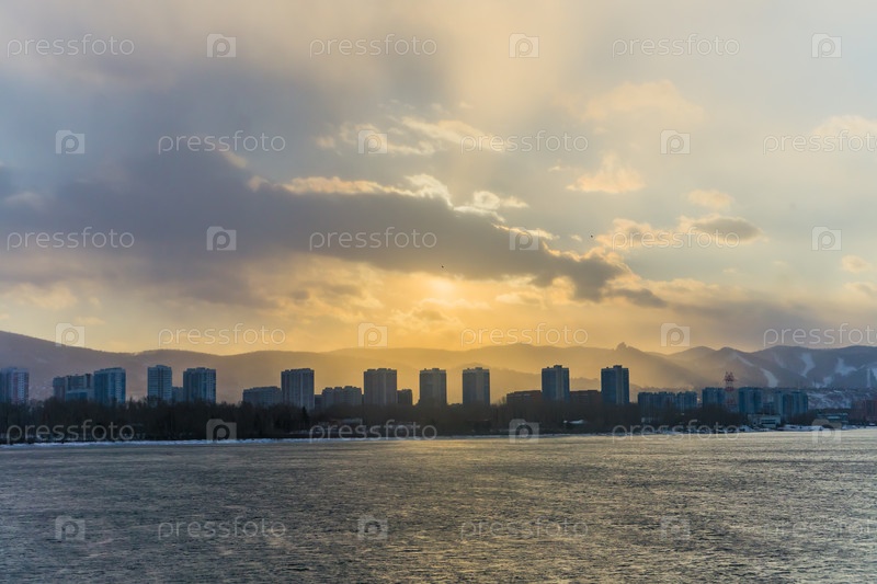Морозное туманное зимнее утро над Енисеем в центре Красноярска
