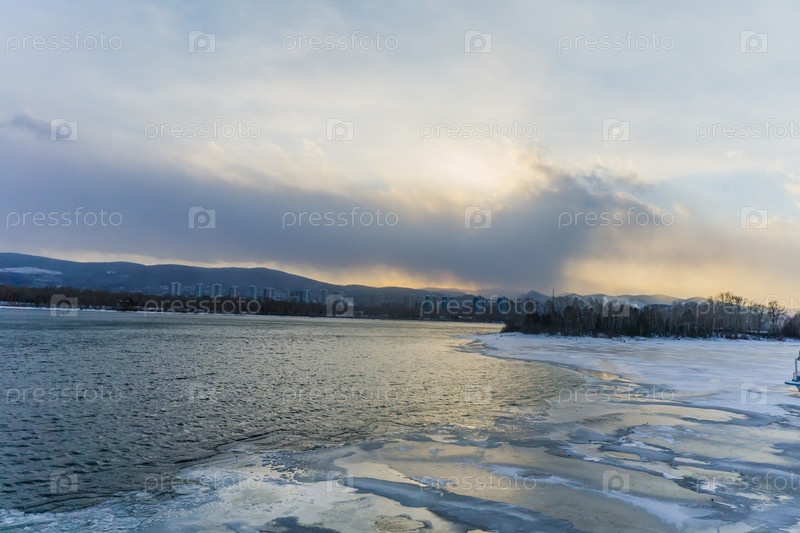 Морозное туманное зимнее утро над Енисеем в центре Красноярска
