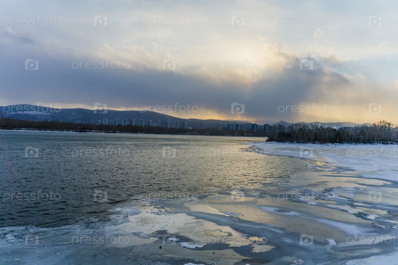 Морозное туманное зимнее утро над Енисеем в центре Красноярска