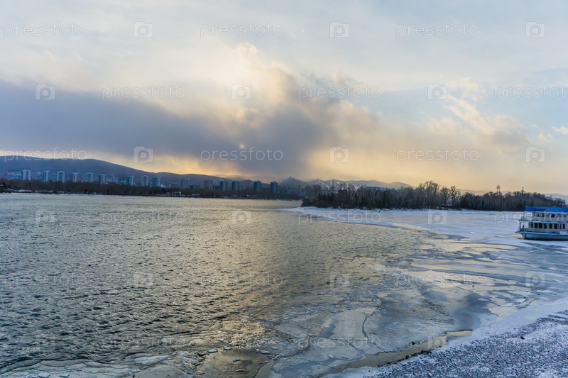 Морозное туманное зимнее утро над Енисеем в центре Красноярска