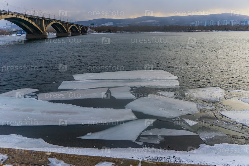 Морозное туманное зимнее утро над Енисеем в центре Красноярска