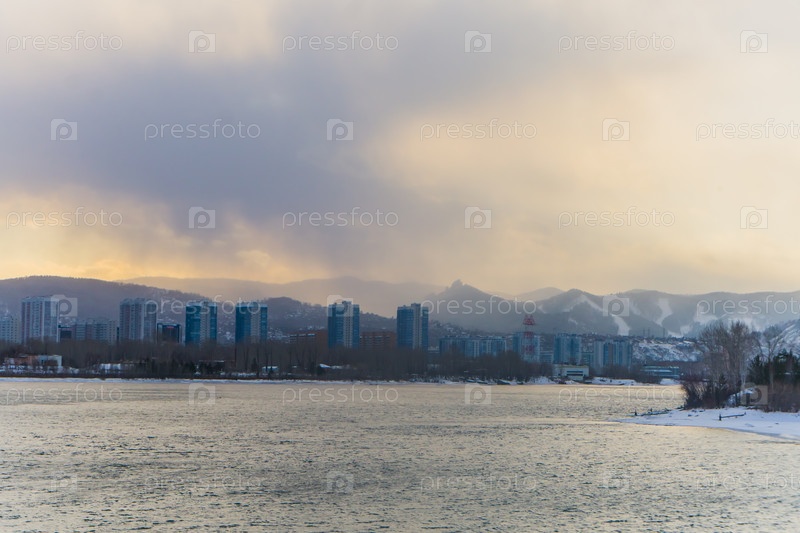 Морозное туманное зимнее утро над Енисеем в центре Красноярска