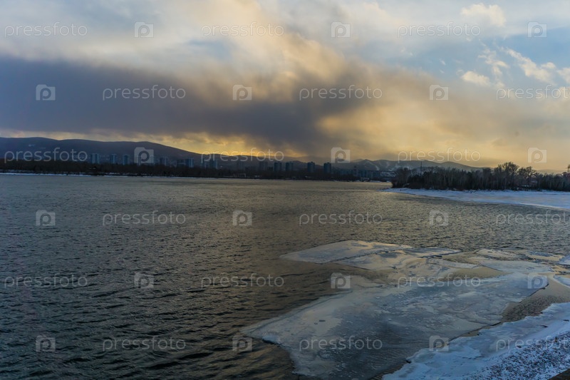 Морозное туманное зимнее утро над Енисеем в центре Красноярска