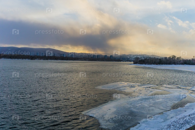 Морозное туманное зимнее утро над Енисеем в центре Красноярска
