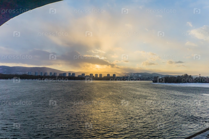 Морозное туманное зимнее утро над Енисеем в центре Красноярска