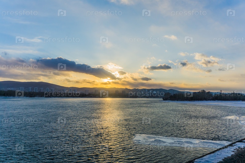 Морозное туманное зимнее утро над Енисеем в центре Красноярска