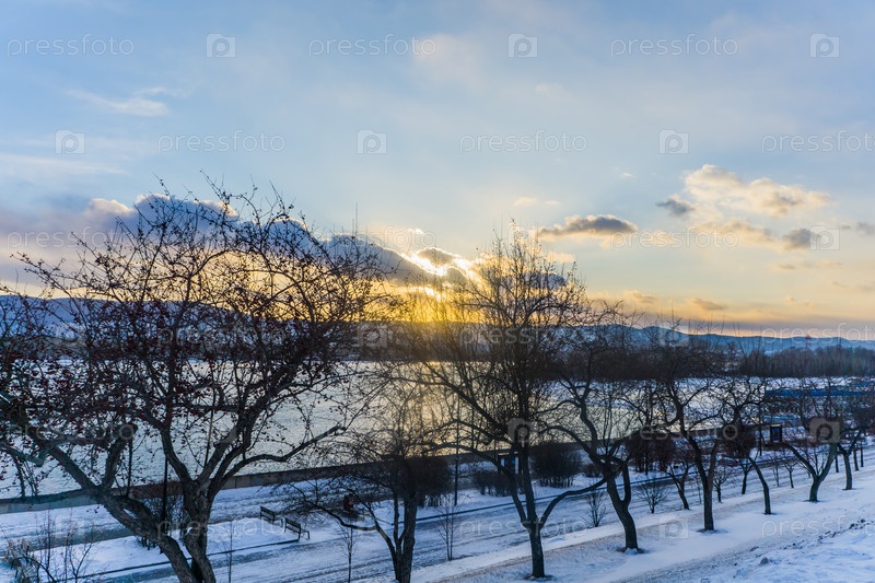 Морозное туманное зимнее утро над Енисеем в центре Красноярска