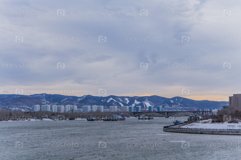 Морозное туманное зимнее утро над Енисеем в центре Красноярска