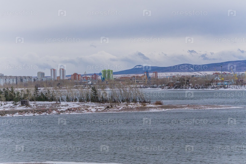 Морозное туманное зимнее утро над Енисеем в центре Красноярска