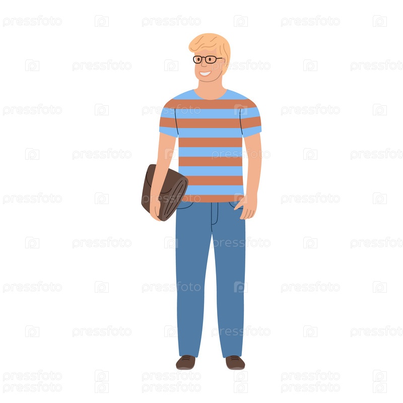 Блондинка в очках стоит с портфелем. Цветная векторная иллюстрация плоского стиля. Белый изолированный фон