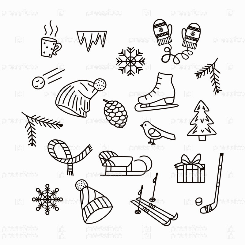 Набор зимних рисунков. Стиль контура черно-белой иллюстрации. Белый изолированный фон